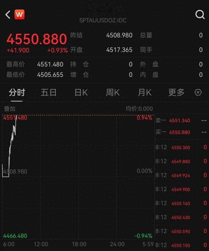 12日早盘,现货黄金(伦敦金现)强势拉涨,盘中突破2025年12月29日盘中创下的历史纪录(4550.520美元),再创新高。截至发稿中金策略,报4550.880美元/盎司,涨0.93%。COMEX黄金期货同步上涨。