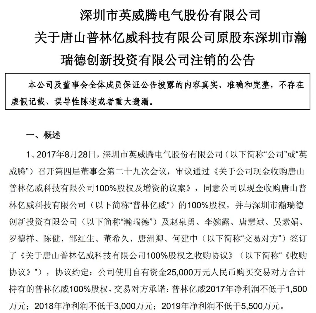 到了2019年5月,英威腾公告称,发现瀚瑞德公司当年1月就在工商管理部门完成注销,且瀚瑞德公司股东在注销前、注销后均未履行告知义务。若普林亿威业绩承诺期净利润未达到考核目标,英威腾向瀚瑞德公司追索业绩补偿款将受到影响。同年,英威腾在深圳对瀚瑞德公司提起诉讼。